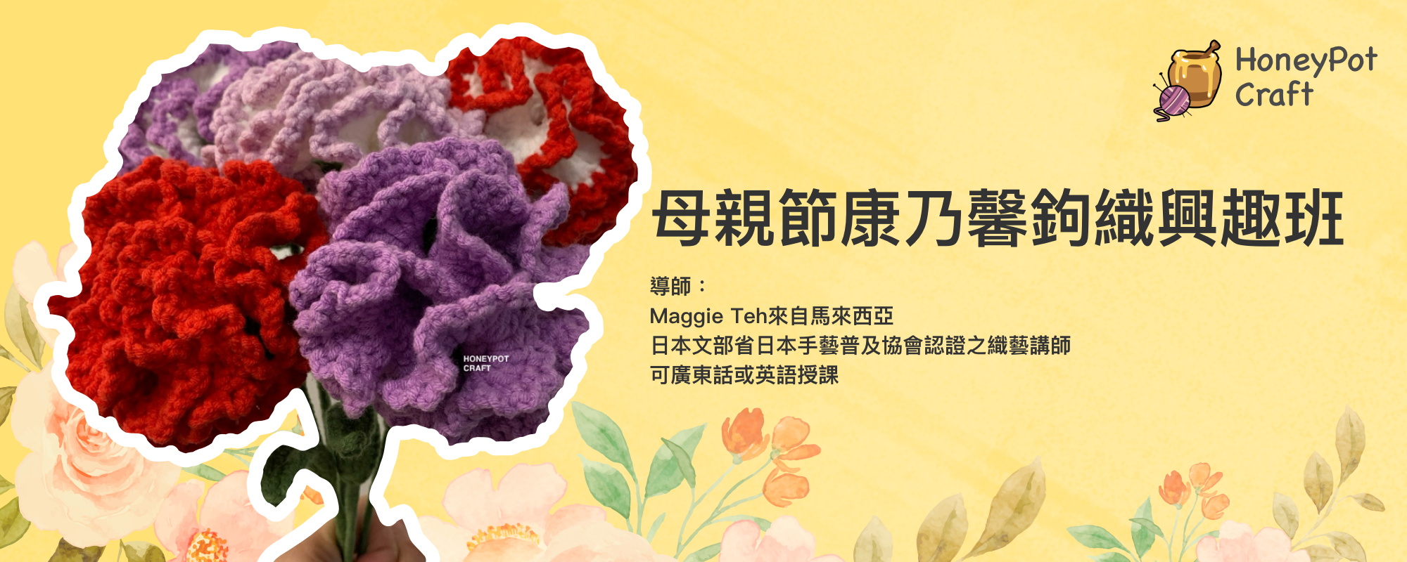 這個工作坊讓你透過日式鉤藝技術,鉤織一朵充滿愛意的康乃馨送給媽媽,這份心意絕對勝過千言萬語!