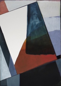 Sheets of paper and fragments of cardboard. Scaled perforations and delicate cracks across wide surfaces. Pale and dark scraps of matter. Bluish tones and earthy reds outlining horizons, drifting freely in different directions. Traces of black forming unstable figures. Shapes that meet and overlap, composing quiet arrangements that fall into their own inner order.