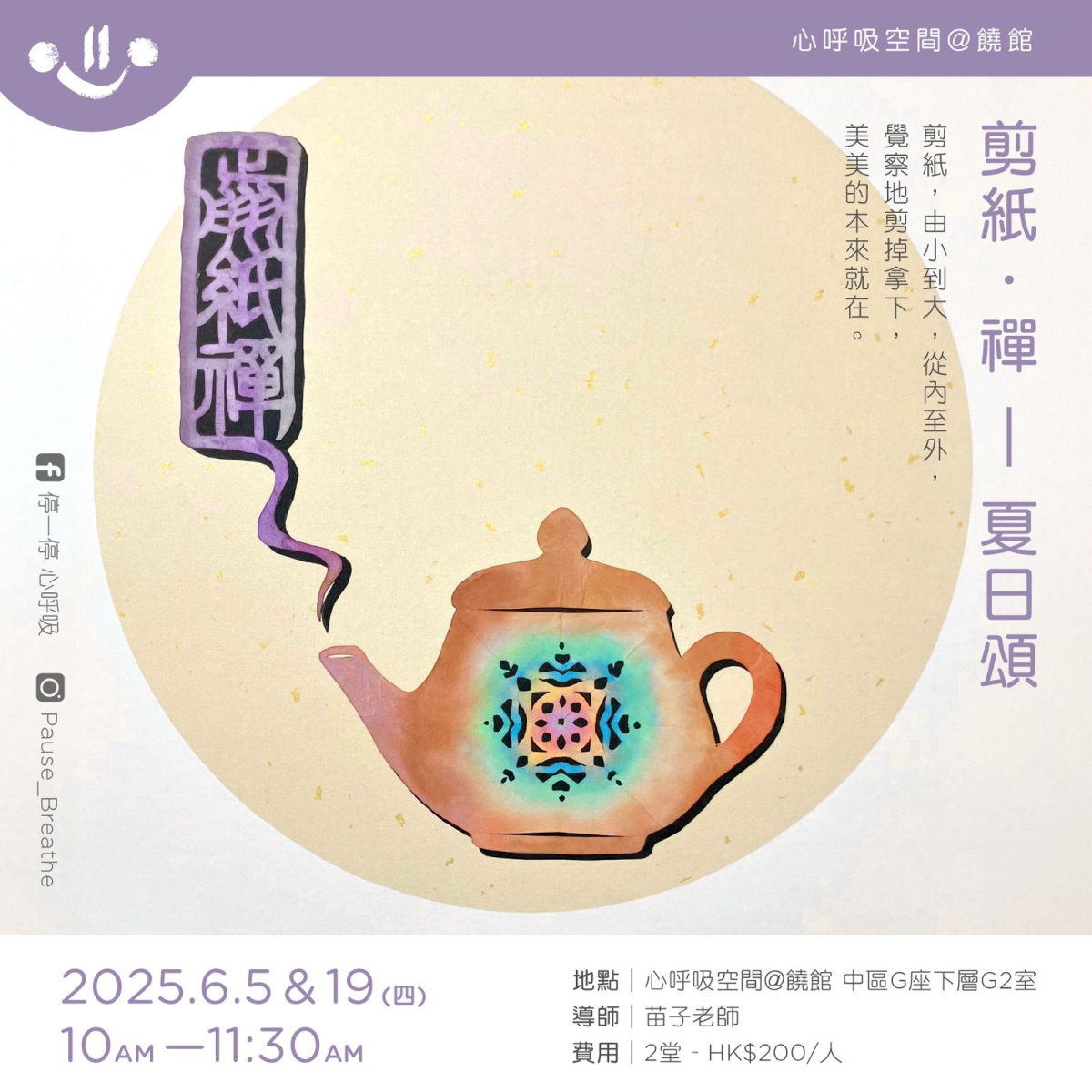 • 請穿著素色上衣及寬鬆長褲,質料以棉、麻材質較宜,以免磨擦發出聲響。