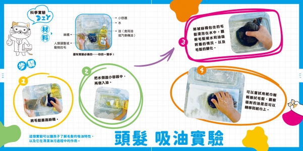 此外,書中設計了「科學大比拼」(如太陽能車VS化石燃料汽車)與「科學實驗DIY」(如頭髮吸油測試)等趣味互動內容,不僅能豐富科普知識,還可促進親子互動,啟發孩子的創意思維與環保意識,帶領他們從日常生活中發掘無限可能!