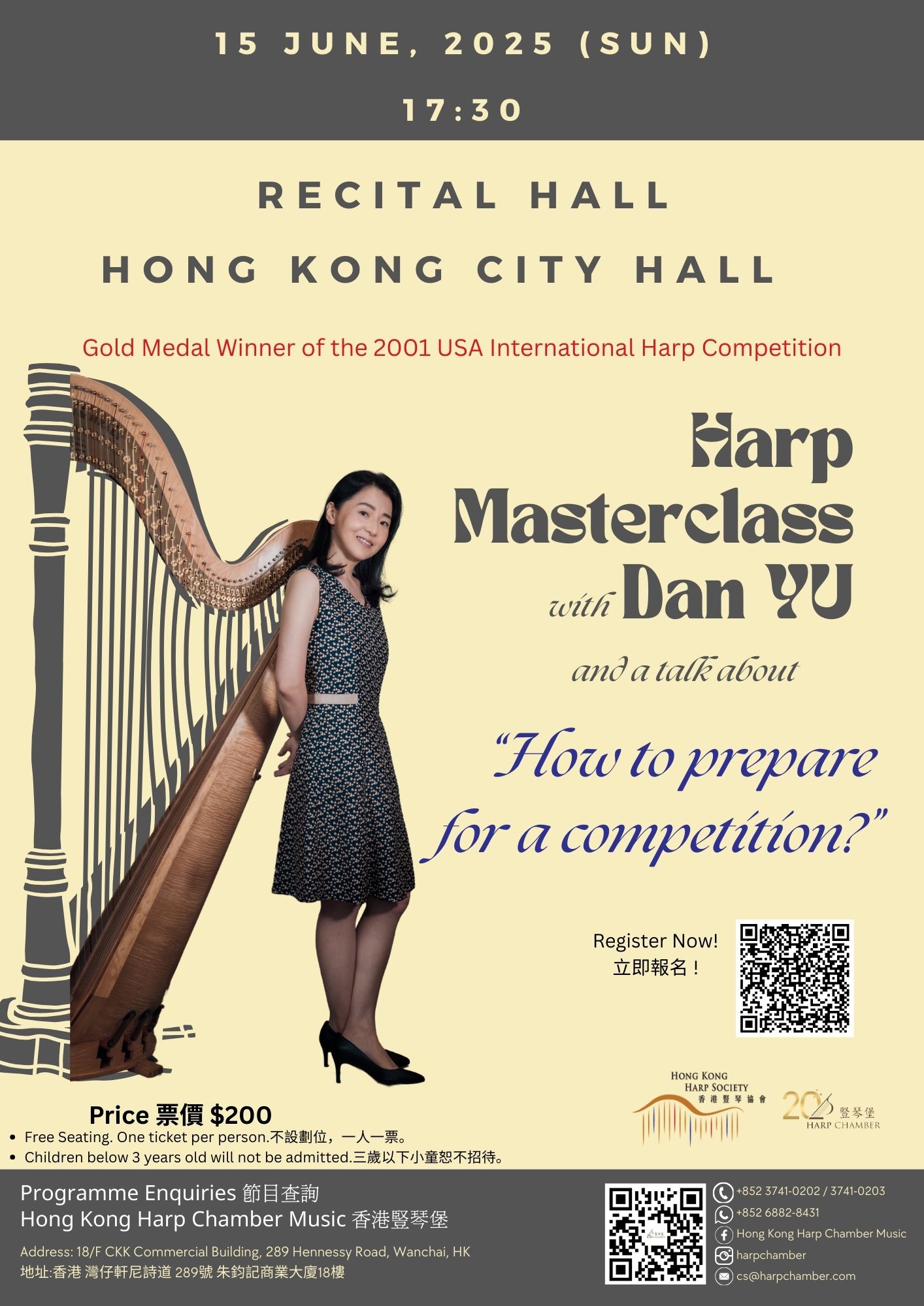 想一睹于丹老師的風采,學習豎琴演奏的精髓嗎?大師班將由于丹老師親自授課,指導年輕演奏者, 並帶來『如何準備比賽』的實用講座, 分享獨家秘訣! 助你提升演奏水平!.廣州星海音樂學院豎琴教授.2001美國國際豎琴大賽冠軍.2011 - 2022 世界豎琴大會理事 (中國代表)