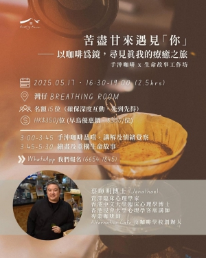 這場工作坊中,資深臨床心理學家兼專業咖啡師Jonathan將先帶領大家透過手沖咖啡的品嚐,展開一場從舌尖到心靈的自我對話。