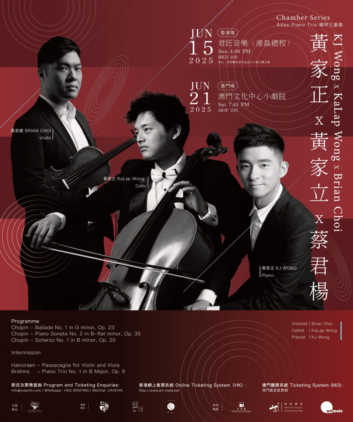 三位享負盛名的音樂家——鋼琴家黃家正、大提琴家黃家立及小提琴家蔡君楊,將攜手演出鋼琴三重奏,展現三種樂器之間的深刻對話。他們將以精湛的技藝傾情演出,帶領觀眾探索音樂的無窮魅力與力量。