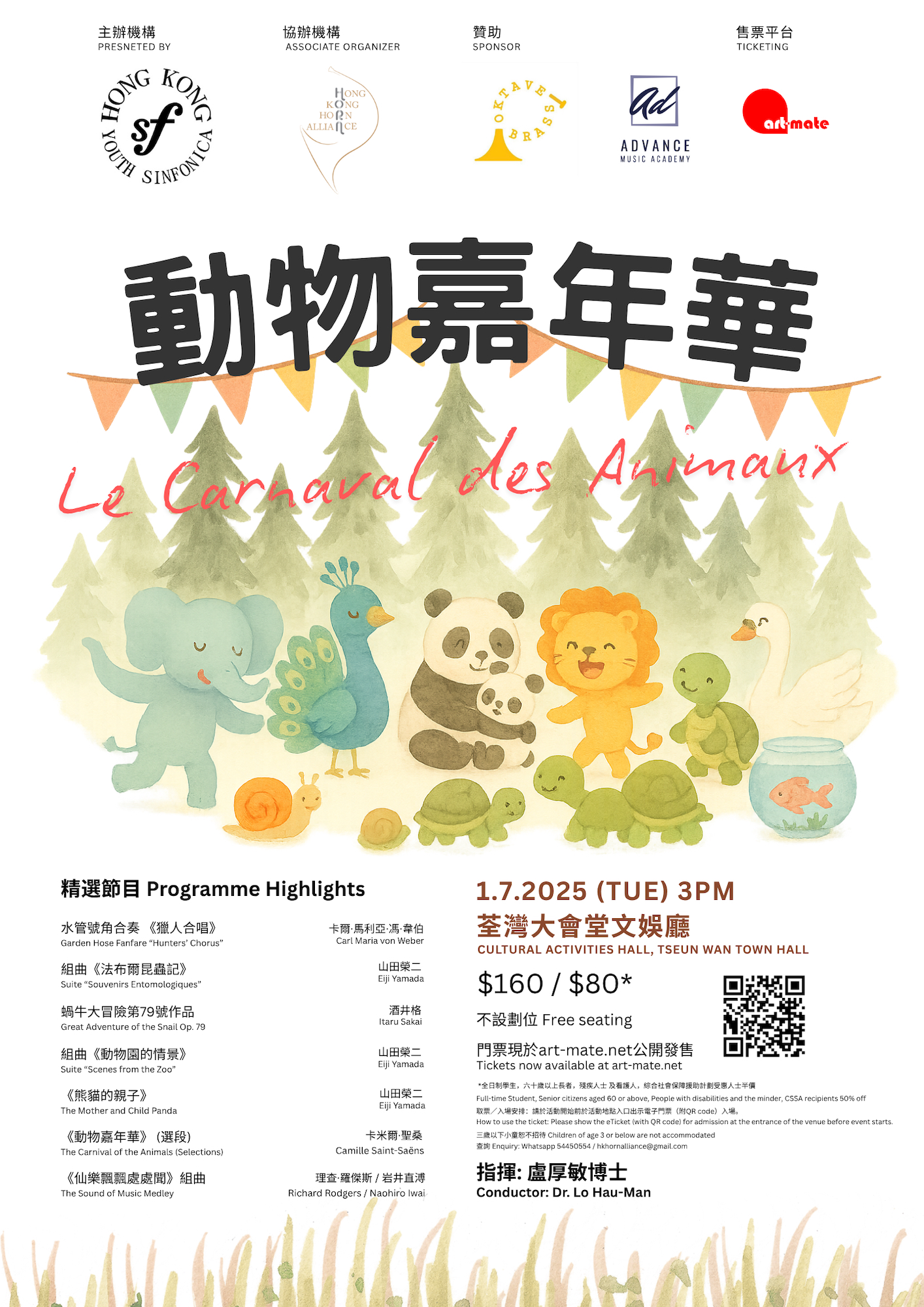 🐾 在這場充滿創意與趣味的動物嘉年華中,快來與 Hong Kong Horn Alliance 一起,以 圓號重奏,透過音樂探索各種動物的奇妙世界!法國作曲家卡米爾·聖桑,以及日本作曲家酒井格與山田榮二,巧妙地運用音樂為動物注入全新生命,描繪出牠們的形態與靈性,生動逼真,活靈活現,令人不禁心生喜愛。