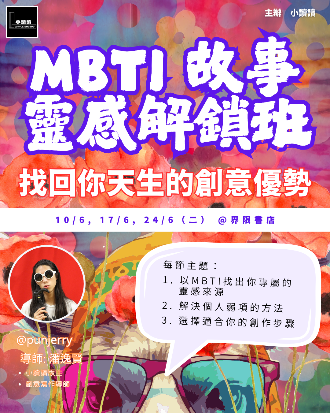 不怕!! 我將會介紹MBTI理論,讓你更了解自身認知功能的強弱。並配以相應的創意寫作練習,助你探索天生的創意優勢,讓創作變得輕鬆順心。