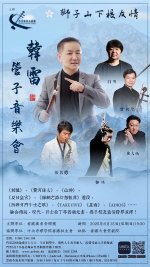 以一根千年古管奏響時代迴聲!中央音樂學院教授、著名管子演奏家韓雷攜手香港藝術家校友天團,跨界融合傳統韻律、流行脈動、爵士即興與拉丁熾熱,在獅子山下展開跨時空音樂對話。音樂會上半場《放驢》、《黃河縴夫曲》表達出勞動人民的詼諧幽默、不屈不撓的堅強品格;《山神》、《關山行》、《星雨》等樂曲的表演讓思緒冥想大自然的神韻中帶來的敬畏之心的起伏,引來無限的遐想和憧憬;下半場音樂會的曲目可以用耳熟能詳、驚喜連連來形容,當《西班牙鬥牛士之歌》、《獅子山下》、《take five》、《Adios》等經典中外名曲以獨奏、連奏、重奏的形式和管子《絲綢之路幻想組曲》、《夏日皇宮》等經典樂曲產生音樂上的貫穿,彷彿敦煌壁畫中的蒼涼管音邂逅維港霓虹的摩登節奏,東方氣韻與世界音流碰撞出璀璨星火的畫面。特邀香江樂壇傳奇人物同台即興,以校友情誼為弦,共織當代國樂的創新圖景——這不僅是一場視聽盛宴,更是一次文化基因的當代覺醒!