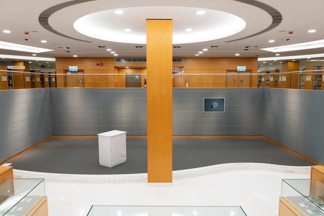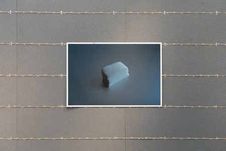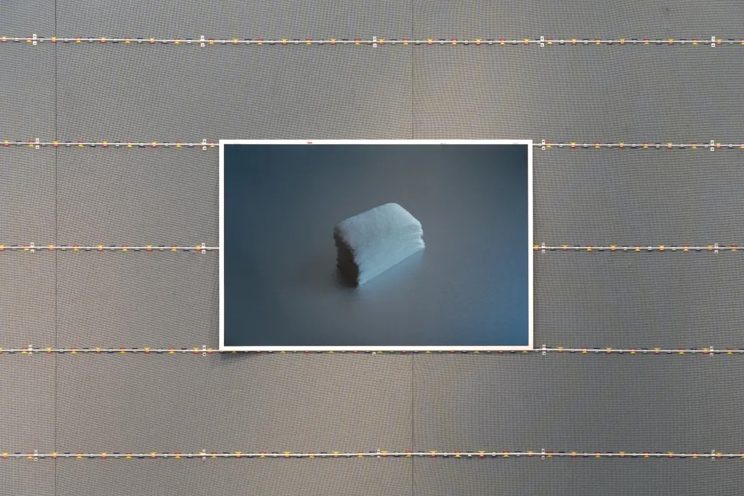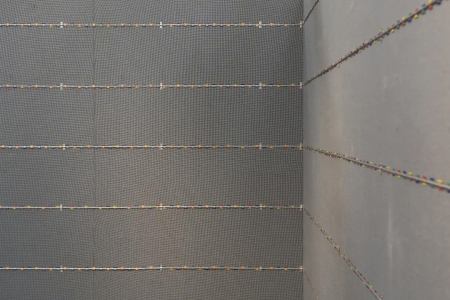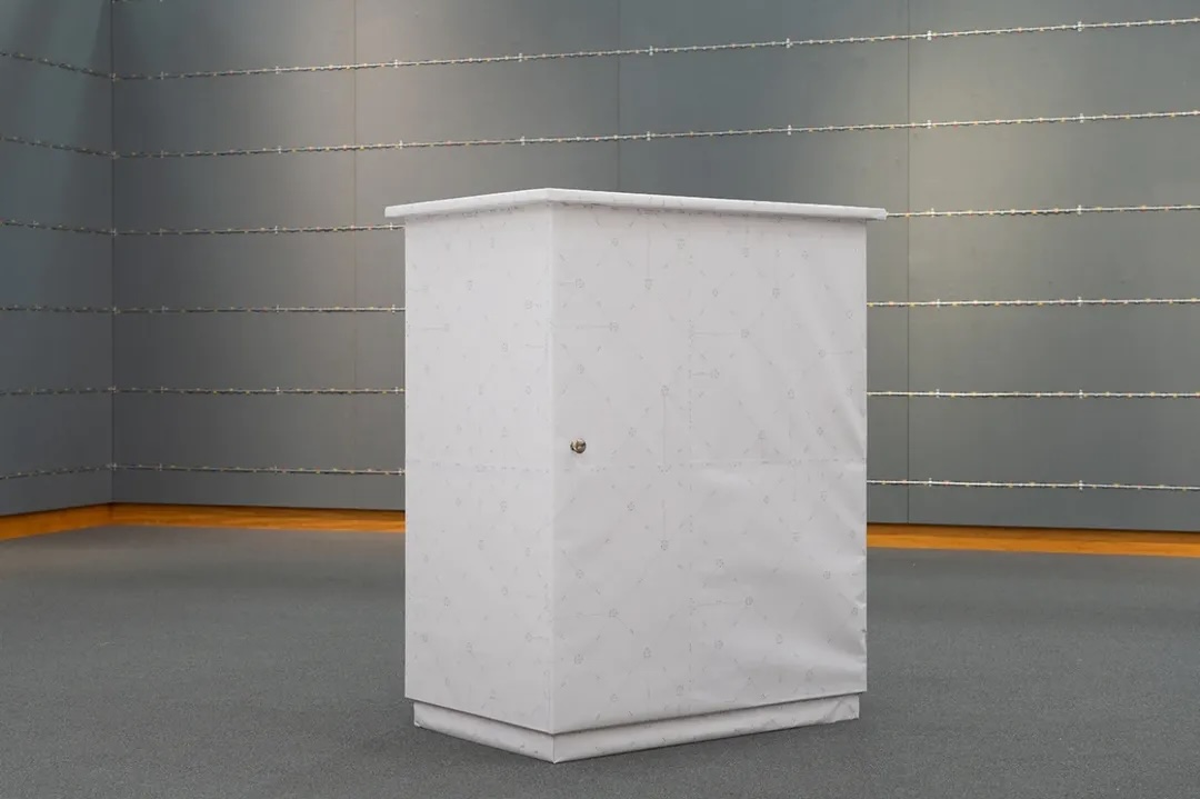 鄺鎮禧的《花邊》(2025)是一組以刀片刺條沾上彩色浸塑液組成的裝置,整齊貼服地分佈於牆壁上,排除了可穿越的夾縫。甜美色彩裹覆著利器,危險鮮明地鞏固著安全意識,點綴這年度節慶。李曉華的《切線練習》(2025)是一件攝影作品,他以醫療紙膠布層層疊起微小白色方塊,過程中他持續修正,防止膠帶彈性及張力所引起的歪斜,他拍下並單純展示其最終結果,隱去誤差的糾葛及勞動過程,餘下晦暗靜謐的樣態。《實屬巧合》是鄺鎮禧及李曉華的合作作品,展場中長年有一個木櫃,既不能被移除亦難以被漠視,滯留於無數個發生於這展場中的展覽。這次我們挪用了研究生二年級雷恩兒在其畢業展的作品《花紙I(如何包裝14.9 × 9.9 × 9.9釐米的長方體)》(2025)來包覆它,在誤讀及誤用下讓這個木櫃成為是次展覽的其中一件巧合的作品。