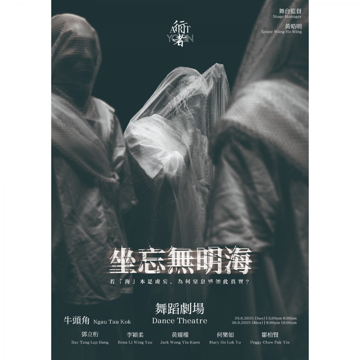 《坐忘無明海》門票開售*謝謝大家踴躍支持!現加開特別場次*加場日子:30.6.2025 (Mon) | 10:00pm————————————若「海」本是虛妄,為何窒息感如此真實?行者Art Yogin 首個舞蹈劇場制作將會由5位團員共同合力創作