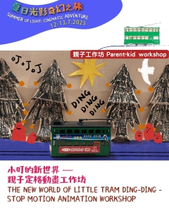 工作坊將以藝術家劉清華創作的繪本《電車小叮在哪裡?》出發,和孩子一起想像,小叮離開香港走進一個幻想世界的旅程。把電影裡「場景」的概念,透過拼貼與繪畫,色彩與質感建構屬於自己的故事空間。最後,藝術家將一起拍攝一段簡單的定格動畫,讓小叮穿梭其中。
