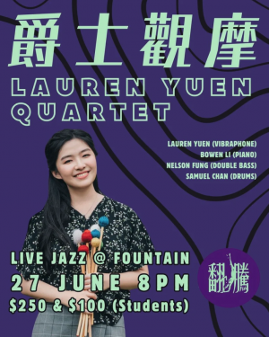 翻騰今次好開心可以邀請到香港少有在古典與爵士樂均有涉獵嘅顫音琴手 Lauren光臨演出。佢今次以" Encounters" 為主題帶來多首原創作品,同一些以顫音琴為主軸的Jazz Standards!