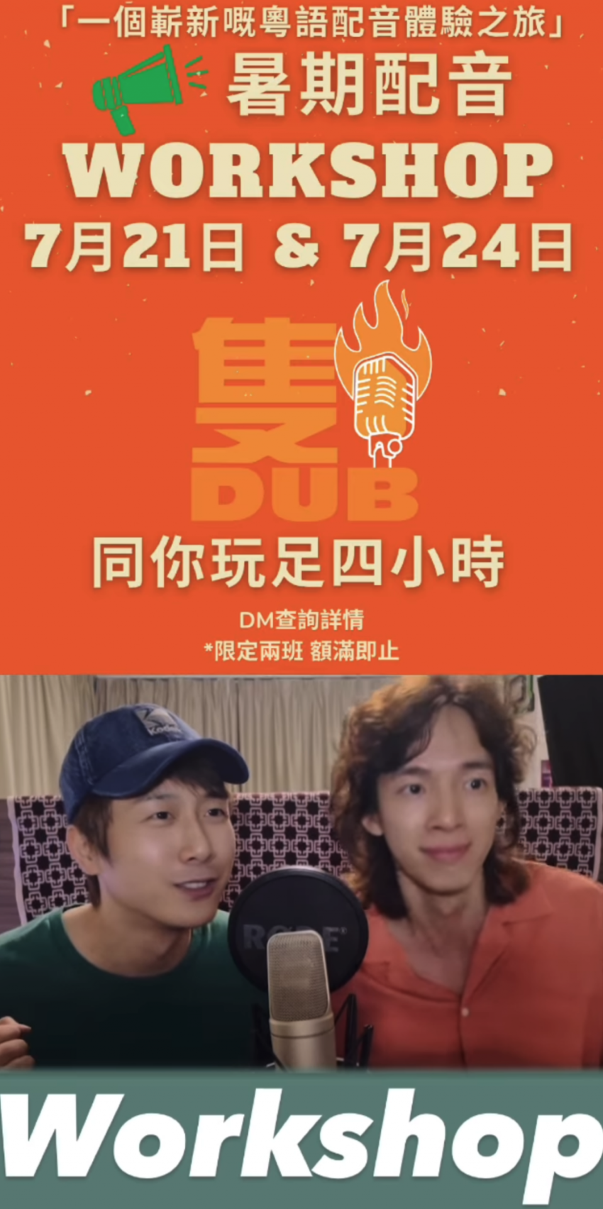 暑期配音WORKSHOP「一個嶄新嘅粵語配音體驗之旅」今個暑假由我哋兩個帶大家配一條屬於你自己嘅配音片一次過接觸曬「呼吸咬字發聲」「分析劇本角色」「埋咪配音」「擬聲配音Foley」實行帶一個充實同有趣嘅體驗俾大家課程:4小時*限定兩班 額滿即止