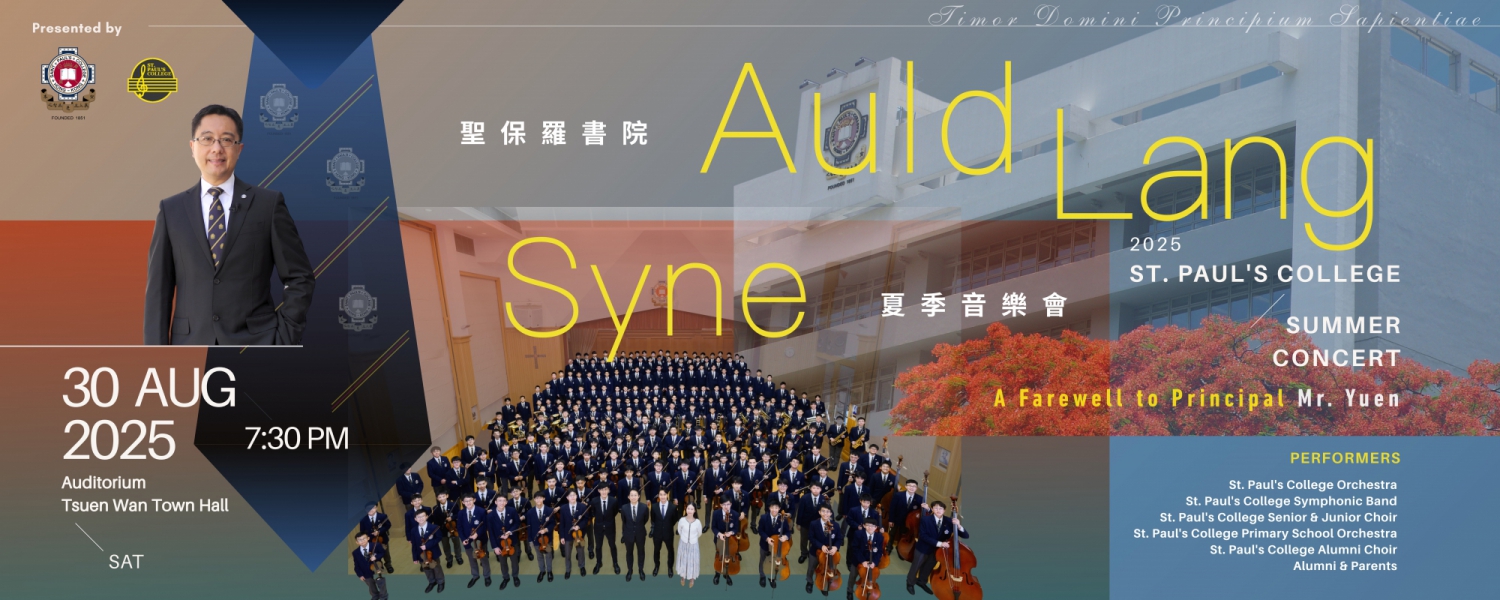 2025 聖保羅書院夏季音樂會《友誼長存——源廸恩校長榮休音樂會》將於 2025 年 8 月 30 日( 星期六 )晚上 7 時 30 分荃灣大會堂演奏廳隆重舉行。本年度音樂盛會旨在致敬源廸恩校長多年來卓越的教育貢獻,由學院各合唱團、管樂團、管弦樂團,聯同一眾校友音樂家、家長及小學部攜手呈獻精彩演出。