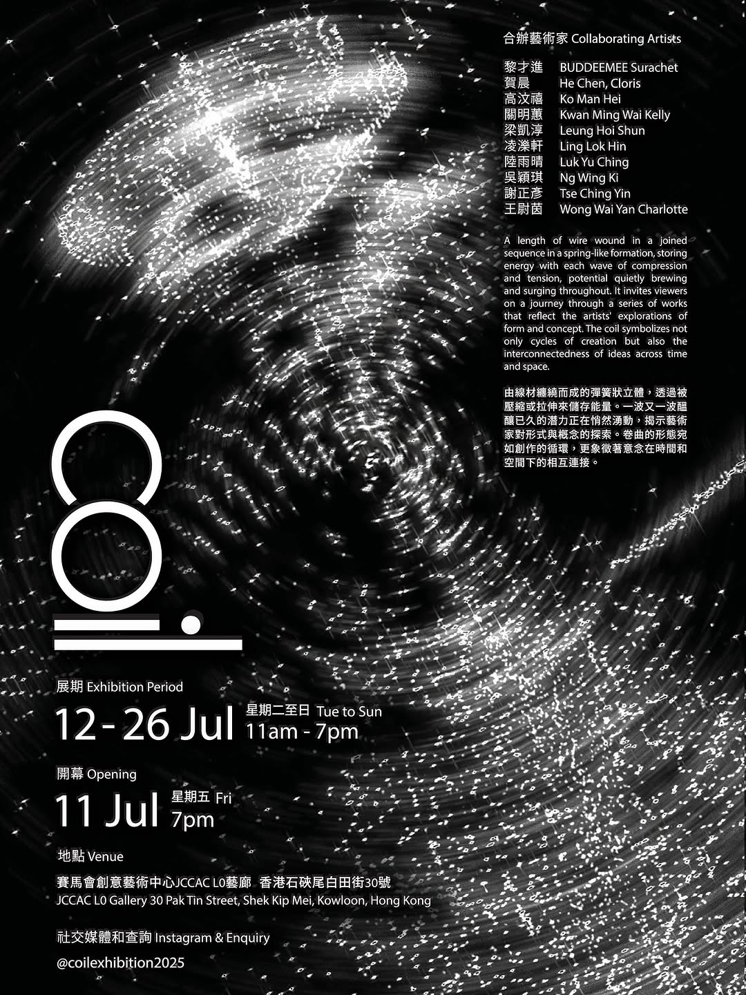 由線材纏繞而成的彈簧狀立體,透過被壓縮或拉伸來儲存能量。一波又一波醞釀已久的潛力正在悄然湧動,揭示藝術家對形式與概念的探索。卷曲的形態宛如創作的循環,更象徵著意念在時間和空間下的相互連接。「Coil」聚焦創作的流動性,更強調想法是如何在不同背景下演變並引發共鳴。藝術家的個人經歷與作品之間千絲萬縷的聯繫,標誌著對理解與本真的追尋,亦是在邀請藝術家與觀者同擁思想與表達之繁複。最終,創作促成一種關於身份、連結、人生經驗三者互相對話的轉化經歷。