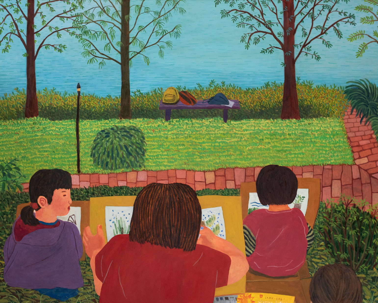 曹穎祺的畫作聚焦於她日常生活和工作中在所觀察到的群體。她過往的創作常描繪生活圈中熟悉的地方,如休憩公園、行人天橋和游泳池,以及城市內人與人的互動。曹氏的畫作刻意將空間壓平,拉近前後空間與人物的距離,配合高飽和度的用色,營造出平凡又親切的公共空間。透過呈現色彩溫潤、關係緊密的社區景態,她探索自身在社群的位置。在本次展覽中,曹氏畫作對外在景物的觀察源自一個更貼身的視角:與家中小狗看著窗外暴雨中的樹景,融入孩子中一同觀察風景寫生,泳手站在蔭下凝望面前的大海……畫面的視點從「內景」延伸向「外景」,引導觀眾踏進畫面瞭望框外遠景,眼前彷如顯現了一全新世界。