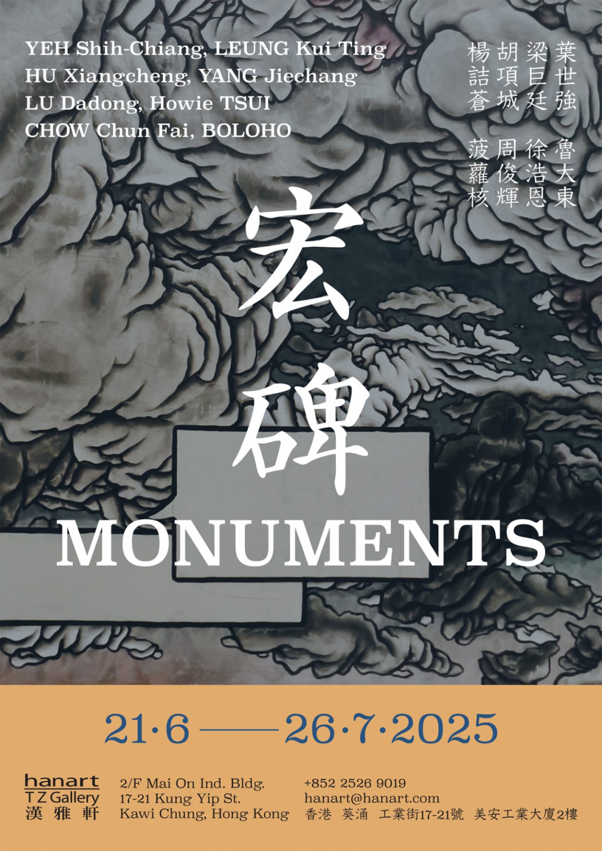 群展《宏碑》訂於 2025 年 6 月 28 日(週六)下午 2 至 6 時 在漢雅軒開幕,展出八位跨世代藝術家的巨幅作品:葉世強 (1926-2012)、梁巨廷 (b. 1945)、胡項城(b. 1950)、楊詰蒼 (b.1956)、魯大東 (b. 1973)、徐浩恩 (b. 1978)、周俊輝 (b. 1980)、菠蘿核 (成立 2019)。