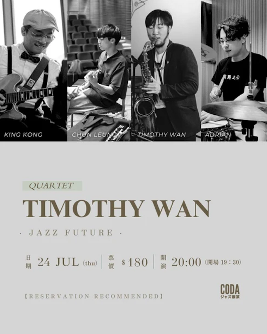 香港資深色士風演奏家Timothy Wan將於七月二十四日,在CODA Jazz Kissa帶領三位年輕樂手,呈現一場純正的爵士音樂會。這場演出將以經典爵士標準曲與硬波普(Hardbop)風格為主軸,展現爵士樂最本真的魅力。