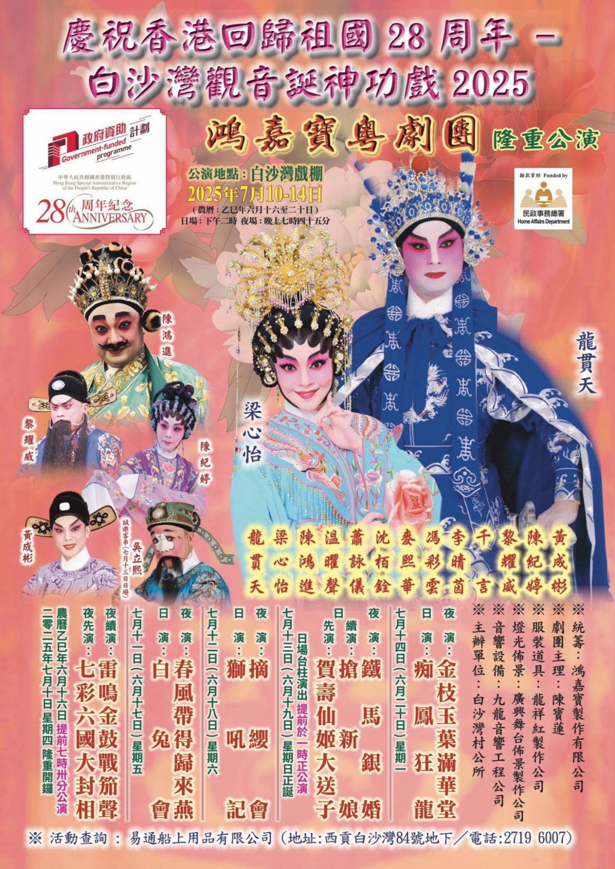 鴻嘉寶劇團 白沙灣觀音誕神功戲2025|《七彩六國大封相》《雷鳴金鼓戰笳聲》《白兔會》《春風帶得歸來燕》《獅吼記》《摘纓會》《賀壽仙姬大送子》《搶新娘》《鐵馬銀婚》《痴鳳狂龍》《金枝玉葉滿華堂》白沙灣村公所