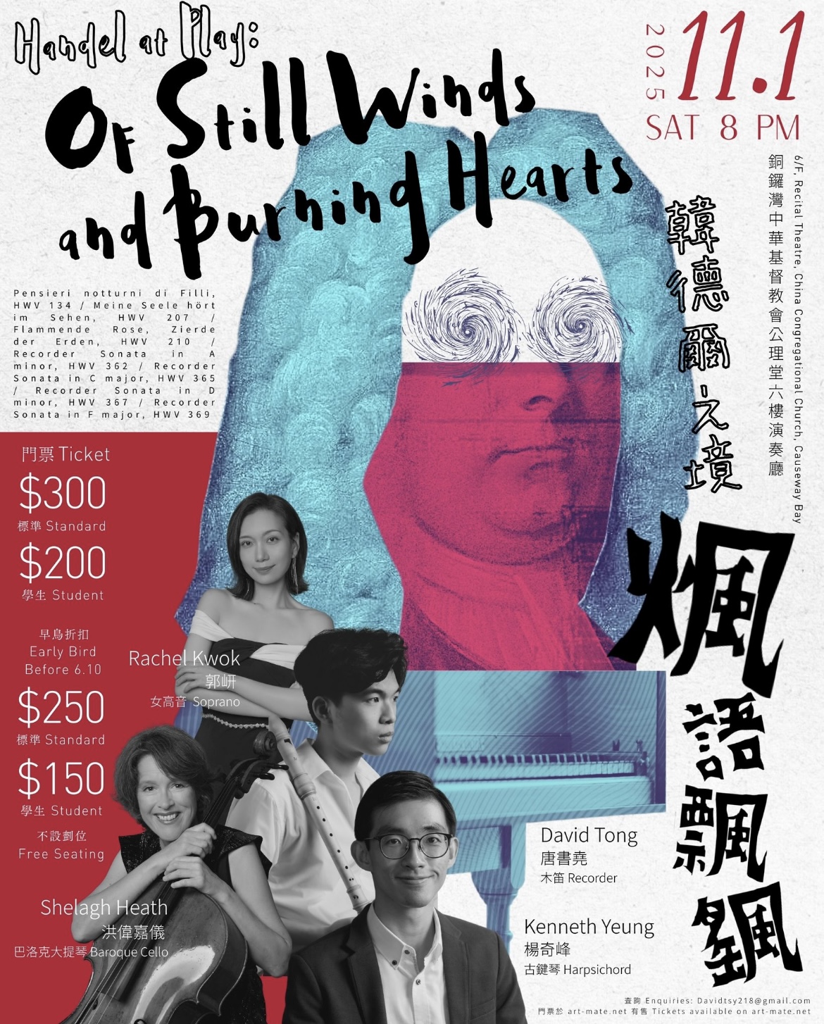 繼去年的《純·巴赫》音樂會,#古鍵琴 楊奇峰與 #木笛 唐書堯再度合作,呈獻《韓德爾之境 : 煈語飄颻》,聯同 #女高音 郭岍 及 #巴洛克大提琴 Shelagh Heath,帶來四首堪稱木笛經典的奏鳴曲,並以新鮮的樂器組合演譯充滿詩情畫意的詠嘆調和清唱劇,引領觀眾進入韓德爾風火交織的世界。