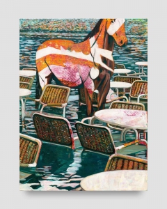 在另一個場景,《凌晨三點的旅店》里——这也是此系列中少數捕捉室內空間的畫作之一——一位披著浴巾的女性彷彿陷入陣痛帶來的幻覺,從通明的樓梯頂端向下凝視著觀者,樓梯隨著堆疊交錯的幾何形狀上下起伏,散發出一種超然感。这里,艺术家摒弃了線性邏輯,而進一步強調扭曲的地形。就像覓食者一樣,這個女性人物在探索一個超乎尋常的費解通道,而這一行為隱喻了繪畫本身的形而上特性:它引領我們——無論是藝術家還是觀者——進入一片無垠的神話世界。