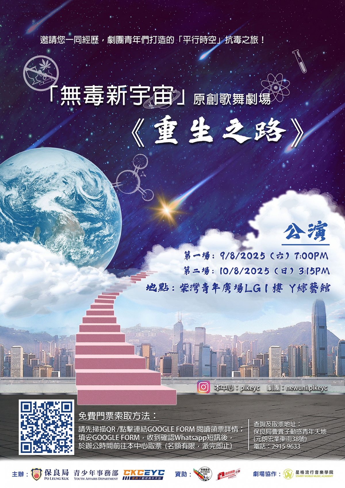承蒙 禁毒基金資助,本中心與來自全港的中學生、職青、年輕舞台劇演員們合力打造一場「穿越時空」抗毒原創歌舞劇。