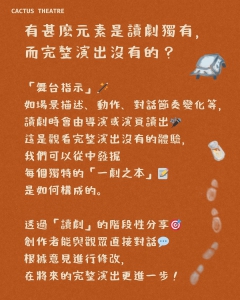 - 讀劇連演後座談,全長約1小時15分鐘,讀劇以廣東話進行。