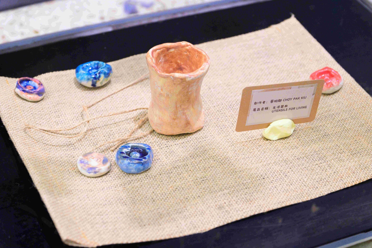 明愛樂義學校專門為六至十八歲中度及嚴重智障學童提供特殊教育、治療、護理及住宿服務,致力激發學生的潛能,幫助他們活出精彩人生。是次展覽中,學生透過捏陶及拉坯的方式,創作出超過三十件充滿個人特色的陶藝作品,主題涵蓋美食、動物、自然景觀、器皿,更有星球和平行時空等抽象概念的創作。與傳統陶藝的工整線條不同,學生的作品保留了鮮明的個人印記—指甲的刻痕、掌紋的壓跡,意外塌陷的邊緣等等,為這批作品添上獨有的美學符號。每一件作品經過窯燒與上釉,呈現出千變萬化的色彩與質感,象徵著每個人都可發揮天馬行空的創意,活出與別不同的豐盛人生。