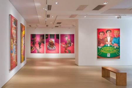 《尖峰時刻》《粉紅警察》《軟糖野獸》等作品畫面充滿了節日氣氛,人物表情卻略顯空洞疏離,彷彿在慶祝中感受到了一種無法言說的孤獨,這種情感的矛盾性使表面上的歡樂與內在的悲哀形成了強烈的對比。閆鏡州透過這樣的畫面,探討了當下社會中個體在集體狂歡中的異化感。如同尤金·奧尼爾的戲劇《送冰的人來了》,人物在酒精與賭博中尋找短暫的逃避,卻無法逃脫內心的空虛,人性中的自我欺騙、絕望與救贖的虛無,被閆鏡州通過「老巴們」的誇張表情和鮮豔色彩,將這一沉重的主題以一種輕快的怪誕形式呈現出來。