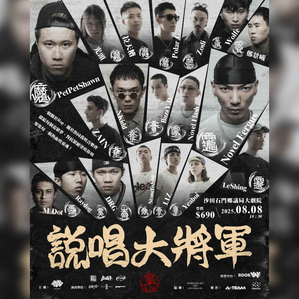 8月8日 眾將速降臨!「說唱大將軍」,神話傳說中的說唱靈魂;祂會賦予凡人靈感,利用文字和韻律創作出衝擊心弦的說唱作品,抵抗絕望的黑暗!8月8日說唱大將軍號令一眾大將,於舞台上把說唱靈魂感染到台下每一次觀眾;只要有心,人人皆可成為說唱大將!一個關於Rap,關於你同我嘅音樂會獻給每個追緊夢,對抗緊絕望嘅你地8月8日,聚集每一個熱血嘅靈魂!