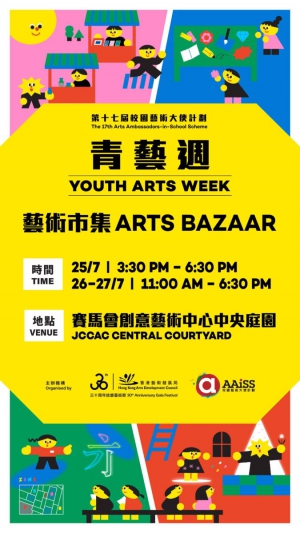 由香港藝術發展局(藝發局)主辦的「第十七屆校園藝術大使計劃」的焦點項目——「青藝週」將於7月25日開幕,呈獻一系列精彩的藝術活動,為今個暑假增添色彩。