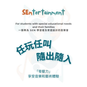 音樂連線 SEN 動樂* 專為SEN家庭設計的互動音樂會* 音樂欣賞 x 互動故事劇場* 小朋友可以「任玩任叫」「隨出隨入」* 家長「零壓力」享受音樂和藝術體驗* SEntertainment -> 打破SEN家庭參與主流娛樂活動的隔閡