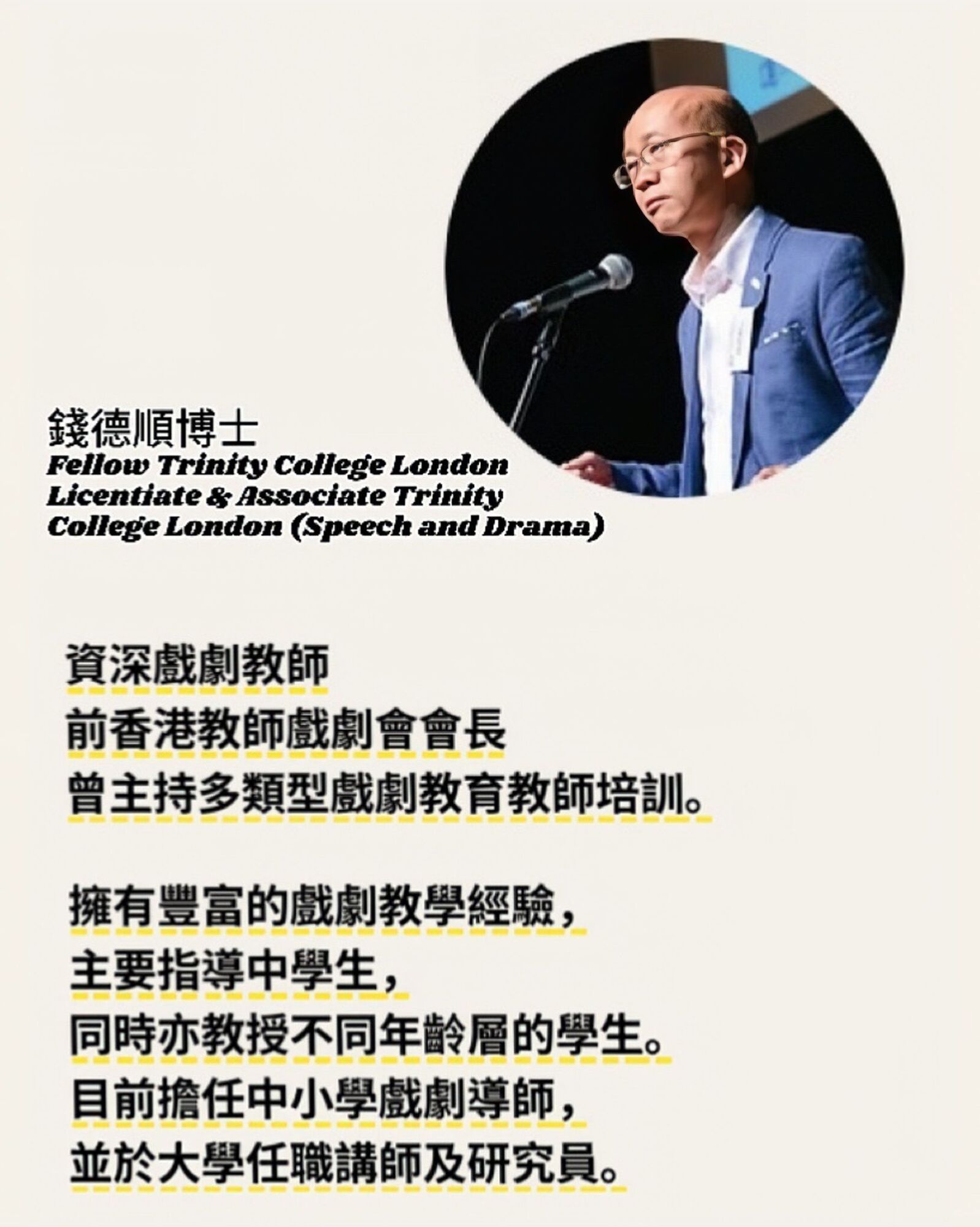 此工作坊是為青少年量身打造的戲劇探索之旅。 將在著名戲劇導師錢德順博士帶領下,以身體訓練、即興表演和團隊共創為核心,通過輕鬆有趣的戲劇訓練,幫助參與者打開身體感知力、激發創意表達,並在安全的環境中培養自信與協作能力。