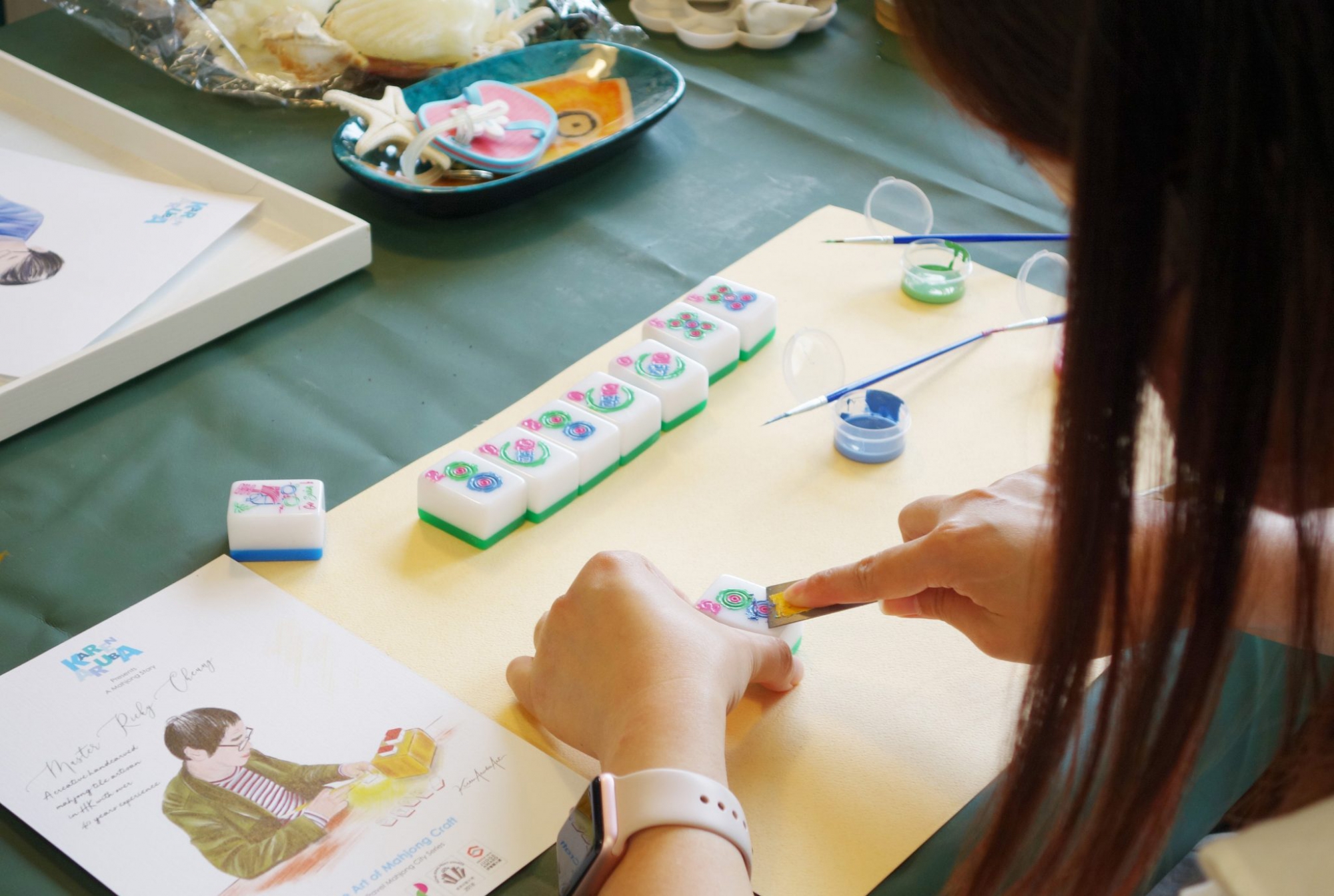 在這裡,傳統麻雀將化身為你的畫布。你可以隨心搭配玩味十足的顏料,為牌面添上獨一無二的色彩,再親手體驗鏟色、以及為筒子「鑽」上圓點的療癒過程。我們提供多特別設計的圖案,讓你盡情發揮創意,將傳統工藝玩出新花樣,製作出專屬於你的藝術品。
