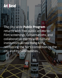 • 遍布全城的公眾項目(Public Program)強勢回歸,免費開放的「光映現場」(Film)電影放映、「與巴塞爾藝術展對話」(Conversations)以及與香港文化機構合作舉辦的活動,進一步鞏固展會與香港及其社群的聯繫。
