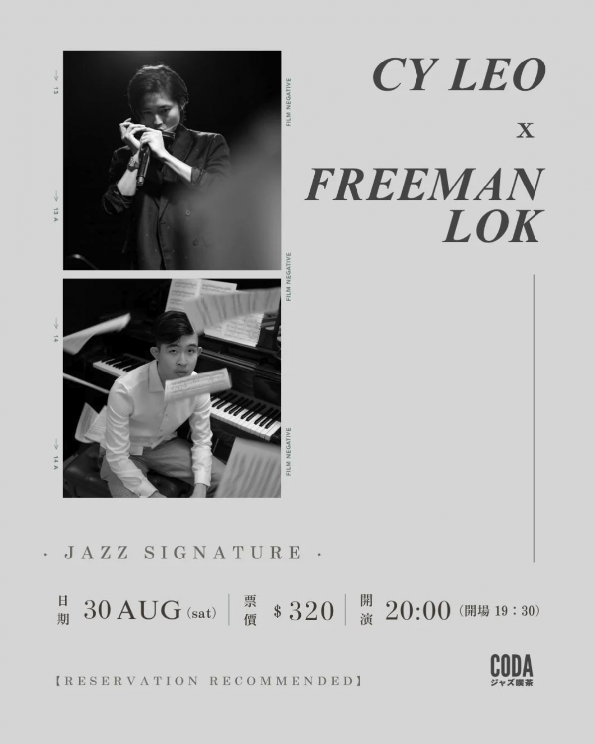 8月30日,CODA Jazz Kissa將迎來一場別開生面的音樂會,由爵士鋼琴手Freeman與口琴演奏家CY Leo聯袂演出。兩位富表演經驗卻同時十分年輕音樂人雖出身背景不同,卻在音樂中找到獨特的默契,將為觀眾呈現一場跨越界限的爵士對話。