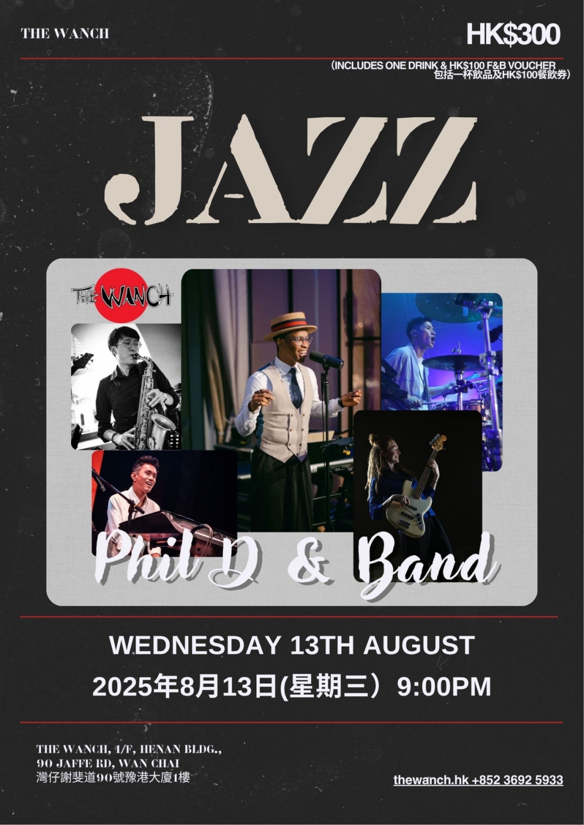 準備好迎接一晚勁正嘅爵士體驗未?8月13日(星期三),The Wanch 請咗Phil D & The Band——強勁五人陣容,向爵士同當代靈魂音樂致敬!