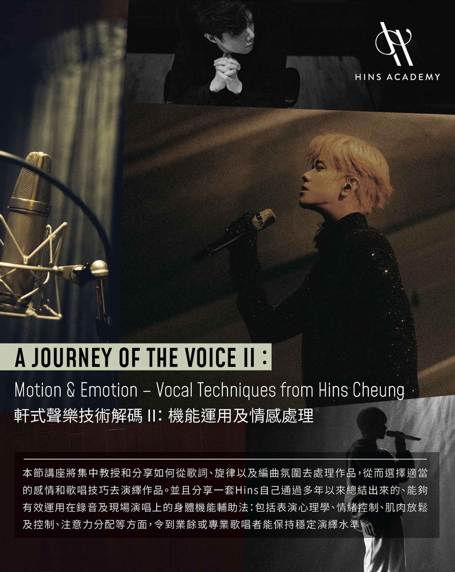 本節講座將集中教授和分享如何從歌詞、旋律以及編曲氛圍去處理作品,從而選擇適當的感情和歌唱技巧去演繹作品。並且分享一套Hins自己通過多年以來總結出來的、能夠有效運用在錄音及現場演唱上的身體機能輔助法:包括表演心理學、情緒控制、肌肉放鬆及控制、注意力分配等方面,令到業餘或專業歌唱者能保持穩定演繹水準。