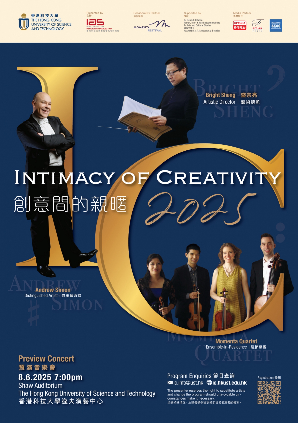 Intimacy of Creativity explores the creative process through public, in-depth Open Discussions on the campus of The Hong Kong University of Science and Technology (HKUST), which presents the festival. Revised compositions by 3 selected Composer Fellows, between ages 20 and 35, are formally presented at Preview Concert on campus, and World Premiere Concert held at the Tea House of the Xiqu Centre at West Kowloon Cultural District of Hong Kong.