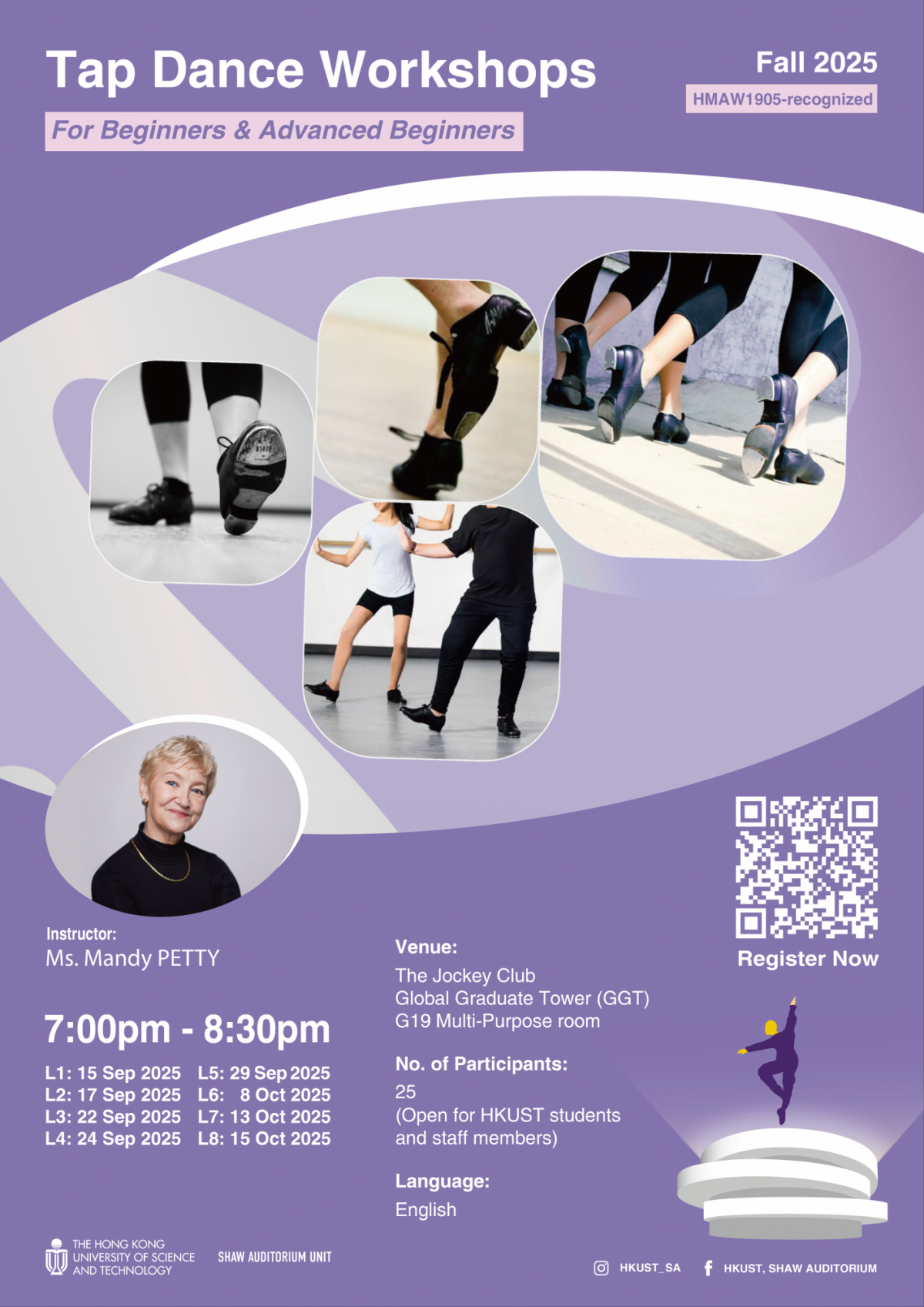 更多詳情:https://calendar.hkust.edu.hk/events/tap-dance-workshops-beginners-advanced-beginners