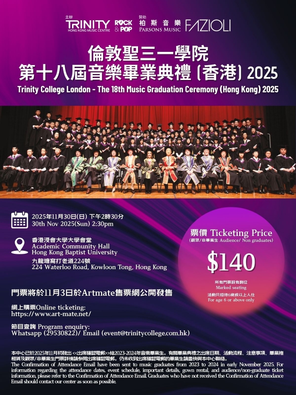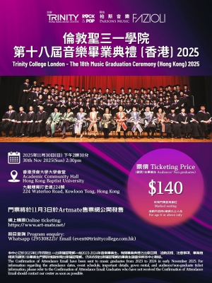 作為音樂界的年度盛事,學院將於2025年年底隆重舉行「倫敦聖三一學院-第十八屆音樂畢業典禮 (香港) 2025」,旨在表揚2023至2024年度成功通過考試的香港區考生。畢業典禮節目內容豐富,包括表現優異的畢業生精彩演出、倫敦聖三一學院榮譽嘉賓演講,以及頒授獎座、證書和合影環節,共同見證畢業生的努力與成果。 此外,畢業典禮將促進畢業生之間的交流,強化音樂社群的凝聚力,讓每位參與者感受歸屬感與榮耀。誠邀所有合資格畢業生參與這場榮耀時刻,與家人、老師及朋友分享音樂路上的喜悅與成就!