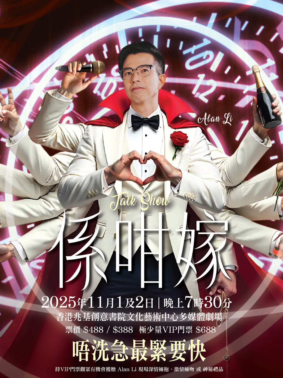 一場婚宴、兩個主角、四大長老、八九個鐘、十萬個問題。婚禮司儀 Alan 注入多年經驗,用一個 talkshow 嘅時間,引爆婚宴中嘅笑與淚。