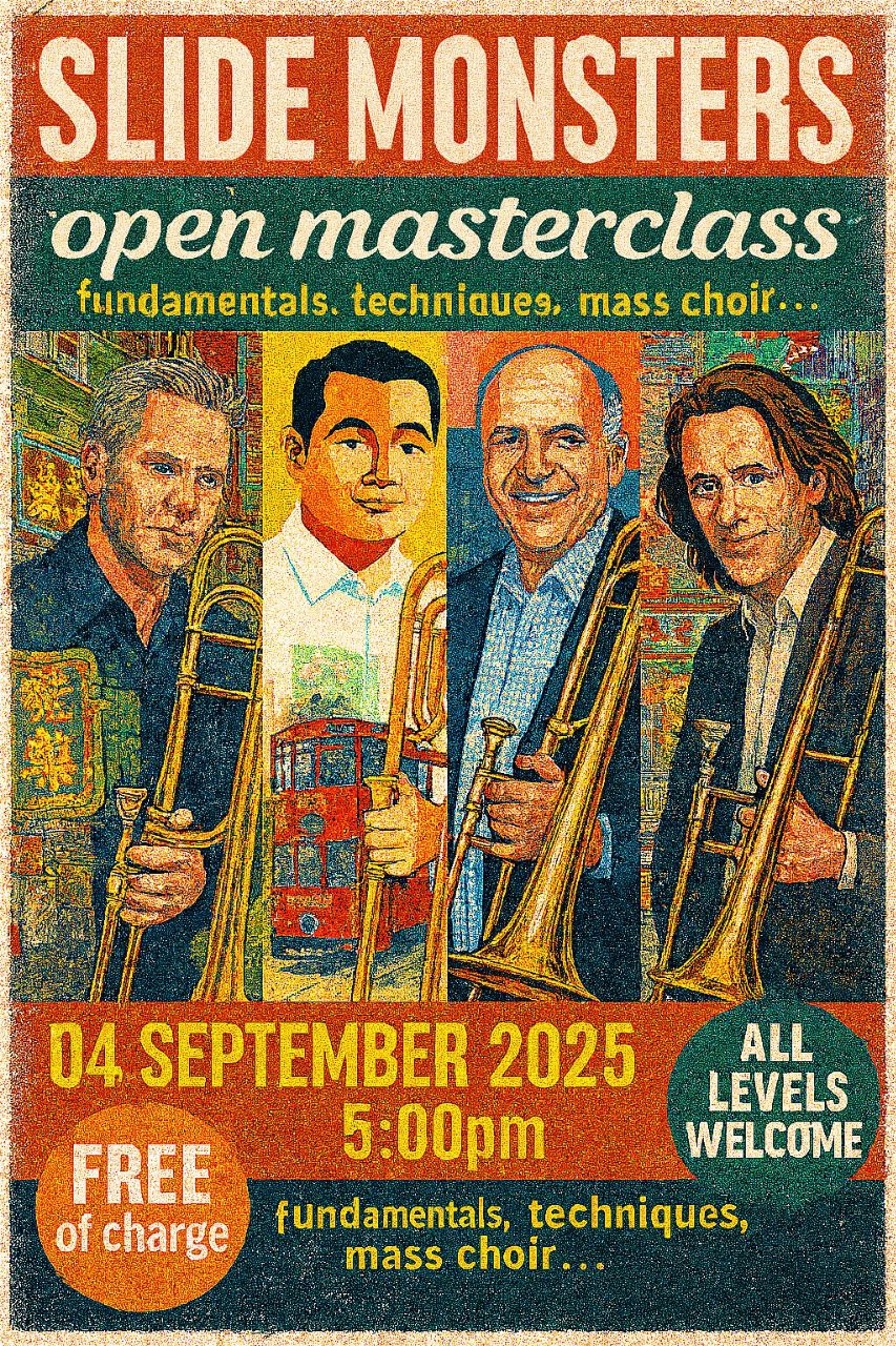 「Slide Monsters 公開大師課」 歡迎任何年齡、任何程度的長號樂手參與。不論你是學生、老師、愛好者;專業、非專業、業餘也好,這場罕有的公開大師課,大大師們將會跟參與者們分享,比標準更標準,成功吹奏長號必須的基本技巧、練習方案等。