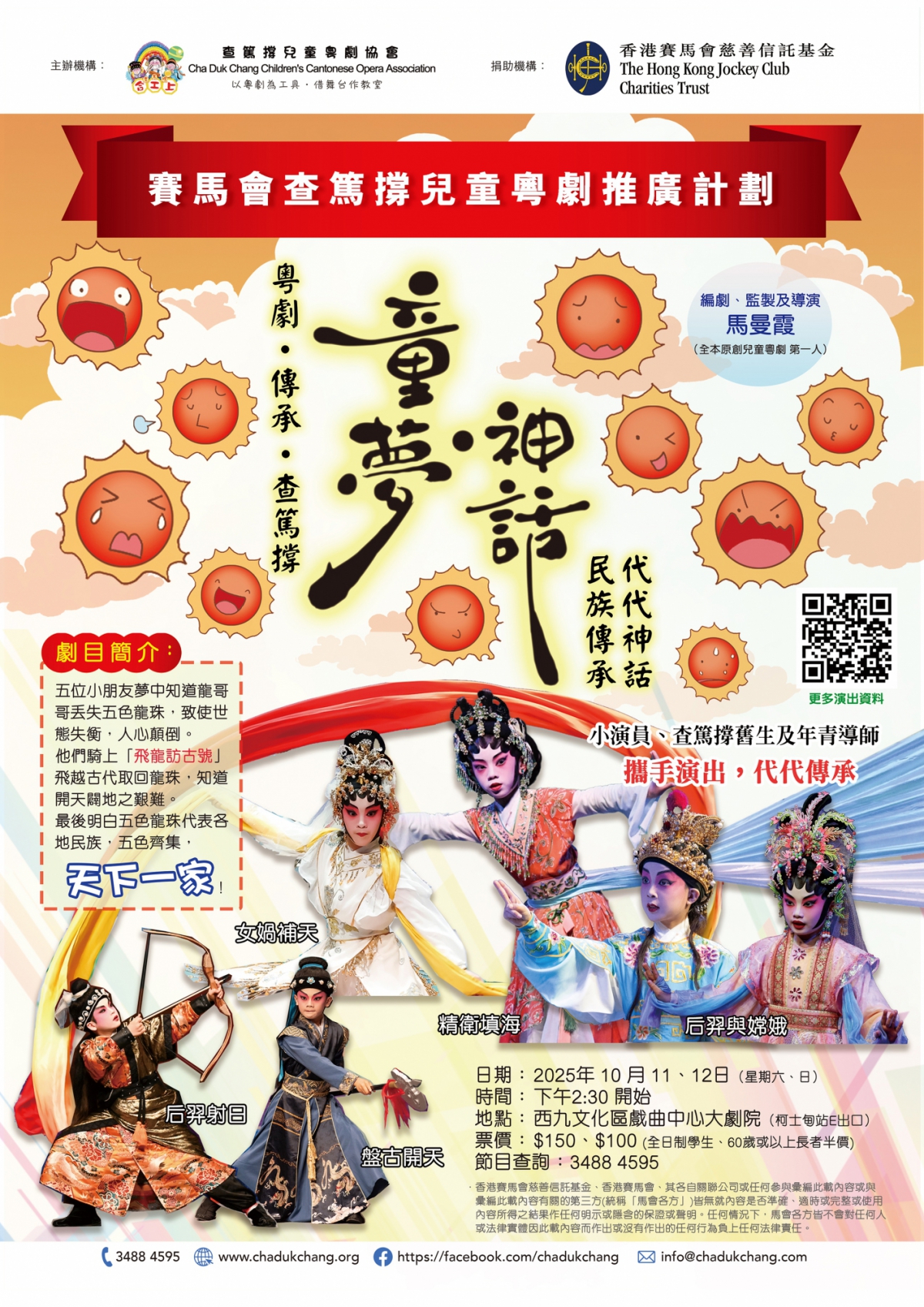 五位小朋友夢中知道龍哥哥丟失五色龍珠,致使世態失衡,人心顛倒。他們騎上「飛龍訪古號」訪尋盤古、女媧、后羿、嫦娥、愚公及女娃,飛越古代取回龍珠,知道開天闢地之艱難。最後明白五色龍珠代表各地民族,五色齊集,天下一家!劇目簡介及觀眾意見: https://www.chadukchang.org/2025p