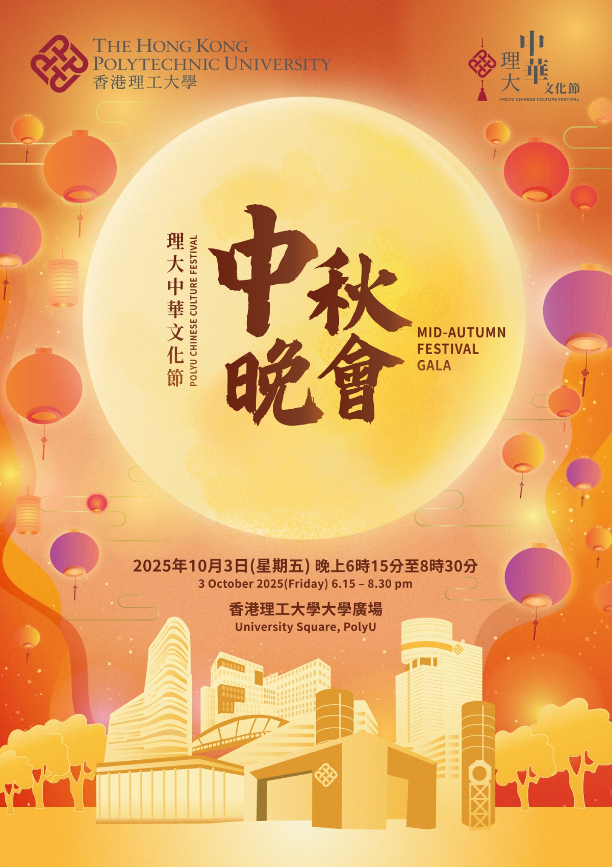 「理大中華文化節—中秋晚會」旨在弘揚傳統中華文化,與理大師生及校友歡聚良宵,在皓月之夜共賞中華文化之美,感受溫馨團圓,留下珍貴回憶!活動包括開幕典禮、猜燈謎及各類藝術文化表演,並同時在理大校園各處設置多個活動區域及拍照打卡區,提供豐富的中國傳統文化體驗。誠邀理大師生、教職員及校友踴躍參與,歡慶這個象徵團圓與傳統的美好佳節。