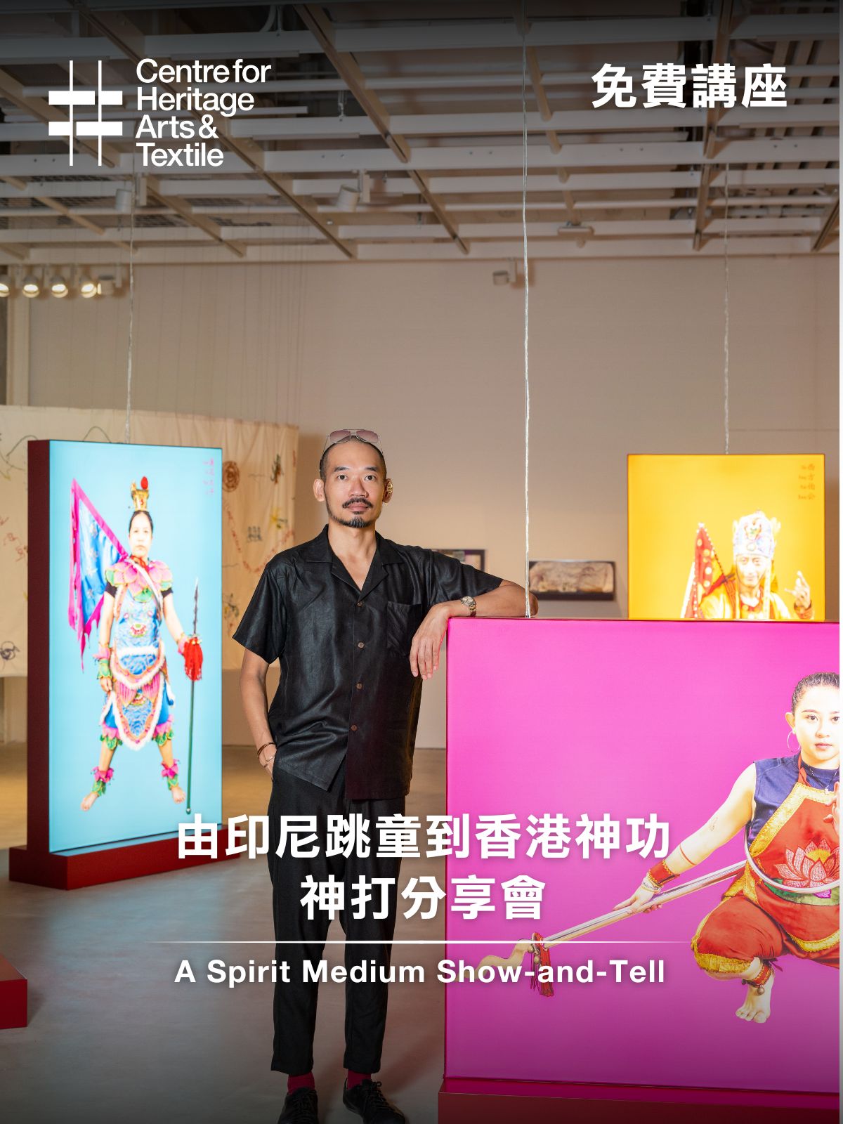 是次講座將帶你走進印尼與香港客家文化的語境,一起探索宗教信仰、民間傳統與日常生活的交界!活動分為兩部分:第一部分中,藝術家葉啟俊將分享他在印尼接觸到「跳童」通靈文化的經歷,以及為展覽「織浪者:浮遊相聚」創作作品的過程;第二部分則由上橫頭胡法旺神功師傅胡聯興先生及大欖涌文化康樂協會代表胡俊境先生分享香港多樣的神功文化。機會難得,萬勿錯過!