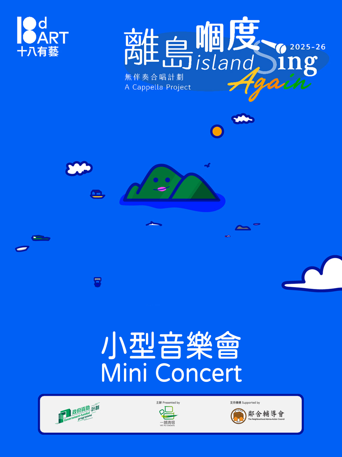 延續去年度計劃好評如潮,一舖清唱再度在離島區推行2025–26十八有藝 — 離島社區演藝計劃《離島嗰度》無伴奏合唱計劃。小型音樂會將由專業無伴奏合唱藝術家帶來精彩表演及互動環節。