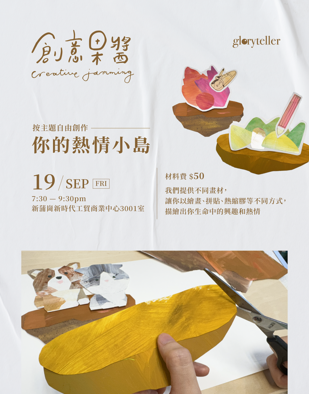 在這空間我們分享靈感、熱忱,無拘無束地創作。創意無分界限,我們不擔憂作品是否嚴謹、完美,只管探索內心的美學、喜惡,想像未來的無限可能。我們會定時聚集按主題進行創作交流,亦會提供各類畫具材料,也歡迎大家帶來材料彼此共享,歡迎任何人士隨時加入聚集創作!- 19/9 按主題自由創作:你的熱情小島*(材料費$50)*以繪畫、拼貼、熱縮膠等不同方式描繪出你生命中的興趣和熱情歡迎帶埋朋友嚟玩
