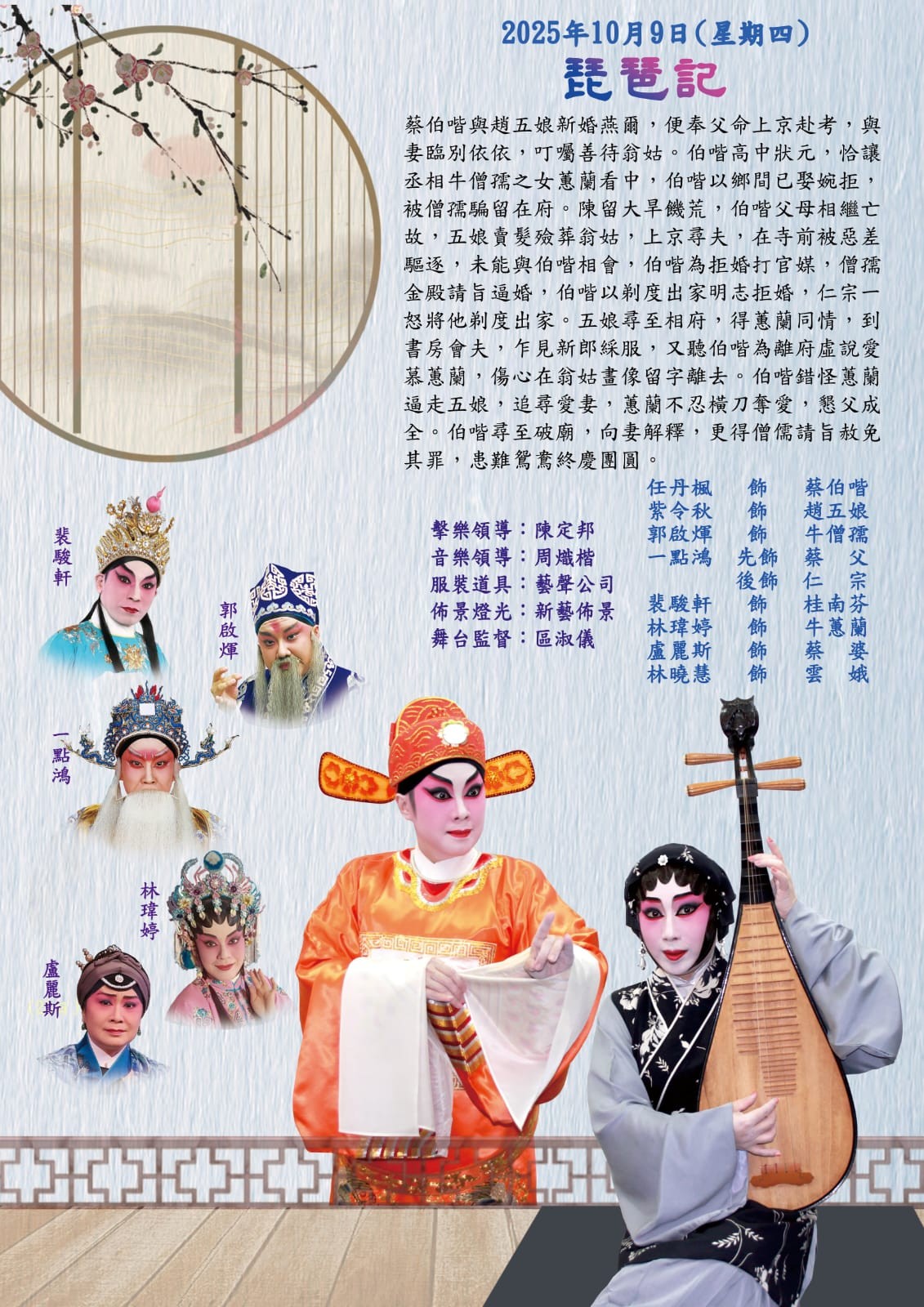 《琵琶記》簡介 蔡伯喈與趙五娘新婚燕爾,便奉父命上京赴考,與妻臨別依依,叮囑善待翁姑。伯喈高中狀元,恰讓丞相牛僧孺之女蕙蘭看中,伯喈以鄉間已娶婉拒,被僧孺騙留在府。陳留大旱饑荒,伯喈父母相繼亡故,五娘賣髮殮葬翁姑,上京尋夫,在寺前被惡差驅逐,未能與伯喈相會,伯喈為拒婚打官媒,僧孺金殿請旨逼婚,伯喈以剃度出家明志拒婚,仁宗一怒將他剃度出家。五娘尋至相府,得蕙蘭同情,到書房會夫,乍見新郎綵服,又聽伯喈為離府虛說愛慕蕙蘭,傷心在翁姑畫像留字離去。伯喈錯怪蕙蘭逼走五娘,追尋愛妻,蕙蘭不忍橫刀奪愛,懇父成全。伯喈尋至破廟,向妻解釋,更得僧儒請旨赦免其罪,患難鴛鴦終慶團圓。