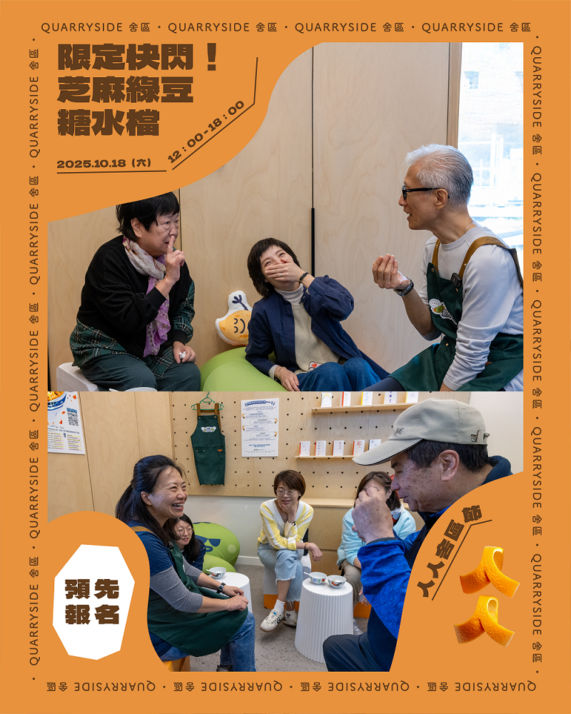 趁暑氣漸消,「芝麻綠豆糖水檔」將限定快閃再次開檔!由銀齡檔主即日新鮮煲煮自家糖水,待你來為糖水加料 —— 和你一起動手搓顏色丸子,閒話家常,將祝福注入丸子,一口吃光!參加者更將獲贈限定紀念品一份。