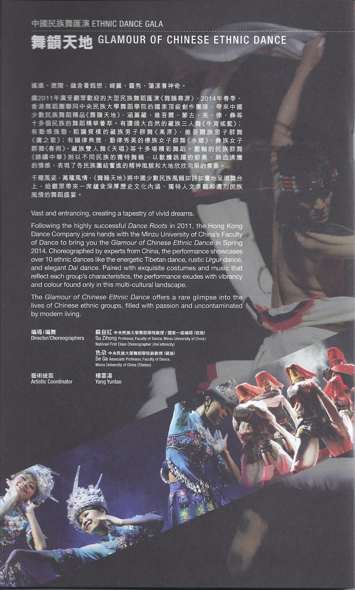香港舞蹈團聯同中央民族大學舞蹈學院的國家級創作團隊,帶來中國少數民族舞蹈精品《舞韻天地》,涵蓋藏、彝、傣、佤、維吾爾等多個民族的舞蹈精華,有讚頌大自然的藏族三人舞《牛背搖籃》,有動感強勁的藏族群舞《高原》和維吾爾族群舞《鷹之歌》,有韻律典雅的傣族女子群舞《水鄉》、彝族女子群舞《春雨》、優美的藏族雙人舞《天唱》等。精彩舞蹈連場,歡騰跳躍的節奏,激發熱血沸騰的情感!