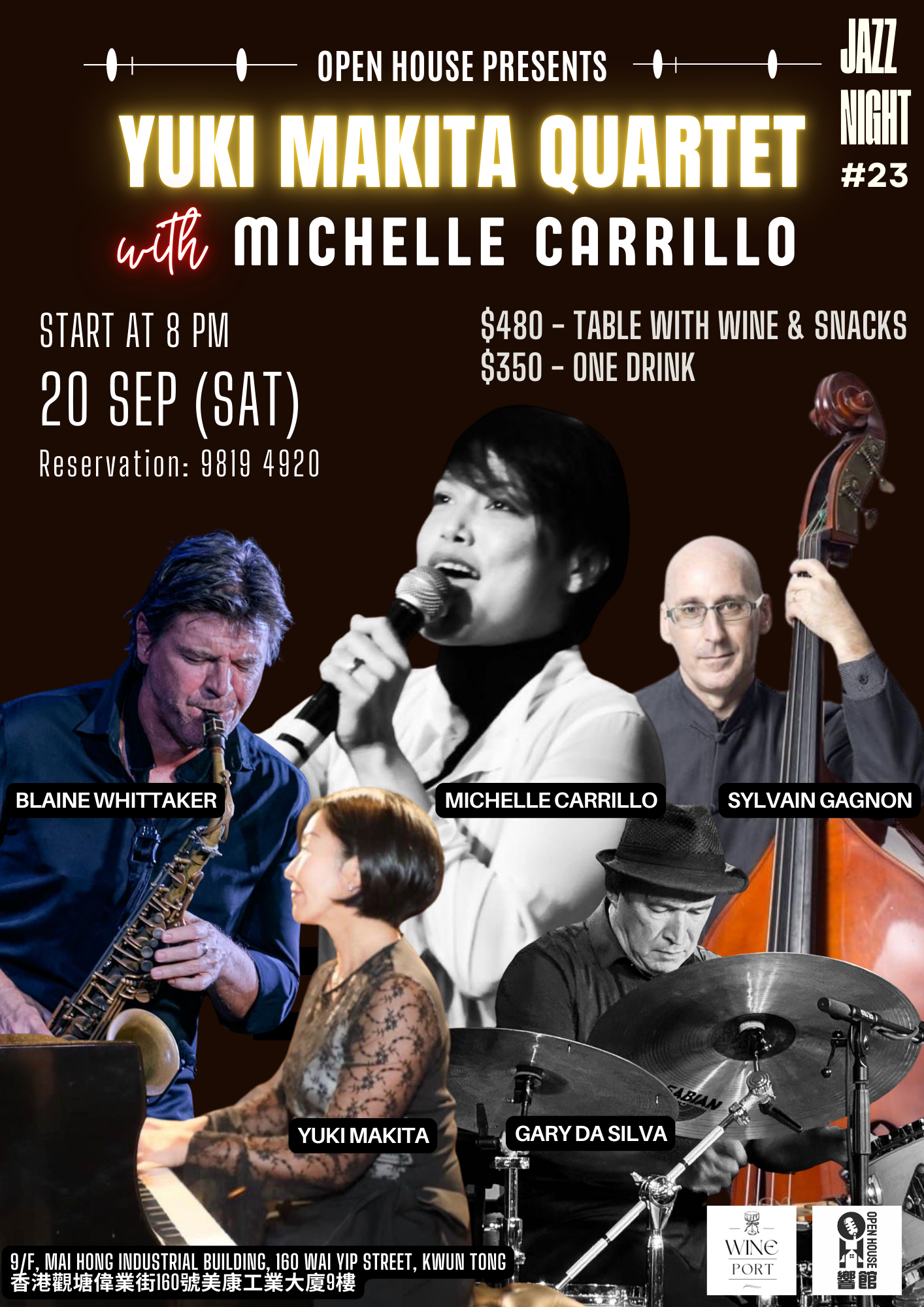 來自日本東京的爵士鋼琴家Yuki Makita(槙田友紀) 將聯同本地爵士樂壇天花板級人馬:傳奇歌后Michelle Carrillo、殿堂級色士風手Blaine Whittaker、著名低音大提琴手Sylvain Gagnon以及爵士鼓大師Gary Da Silva,於20/9(星期六)晚8時正在Open House(觀塘店)為大家帶來精彩絕倫的演出,各位請預早留位,萬物錯過!